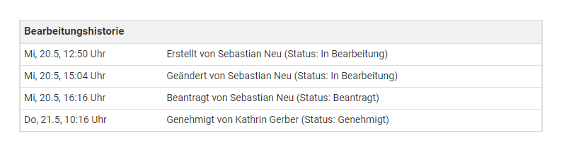 Bearbeitungshistorie" angezeigt, welcher Nutzer den Eintrag zu welchem Zeitpunkt eingegeben, geändert, genehmigt, abgelehnt, usw. hat.