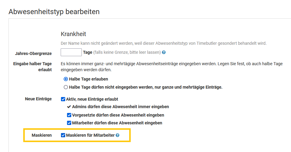 Die Maskierung kann für jeden Abwesenheitstyp individuell aktiviert und deaktiviert werden, wie folgt:
