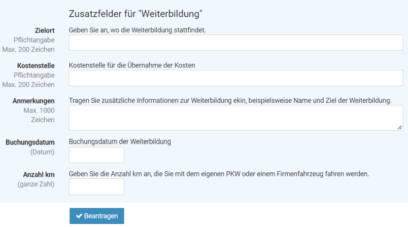 Wenn ein Mitarbeiter dann einen neuen Dienstreise-Antrag eingibt, bekommt er im Eingabeformular die von Ihnen eingestellten Zusatzfelder angezeigt und kann die Angaben eintragen: