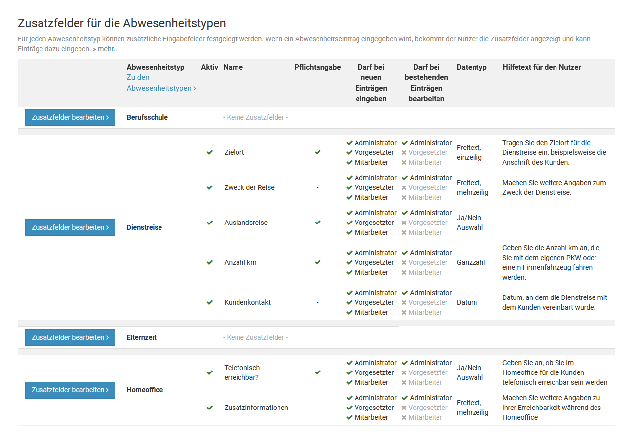 Screenshot: Konfiguration der Zusatzfelder für Abwesenheitstypen