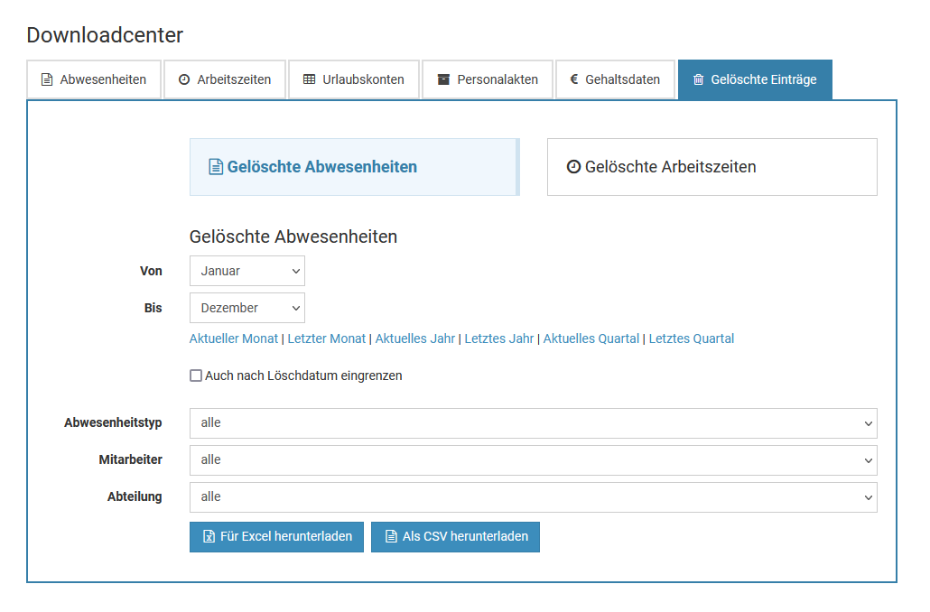 Timebutler protokolliert gelöschte Abwesenheitseinträge mit Zeitstempel und der Information, wer den Eintrag gelöscht hat. Über das Downloadcenter können die gelöschten Abwesenheitseinträge bequem mit wenigen Mausklicks als Excel-Datei oder CSV-Datei heruntergeladen werden.