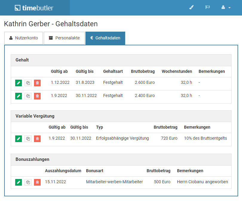 Neben der Personalakte können Sie für jeden Mitarbeiter auch Gehaltsangaben, variable Vergütungen und Bonuszahlungen verwalten.