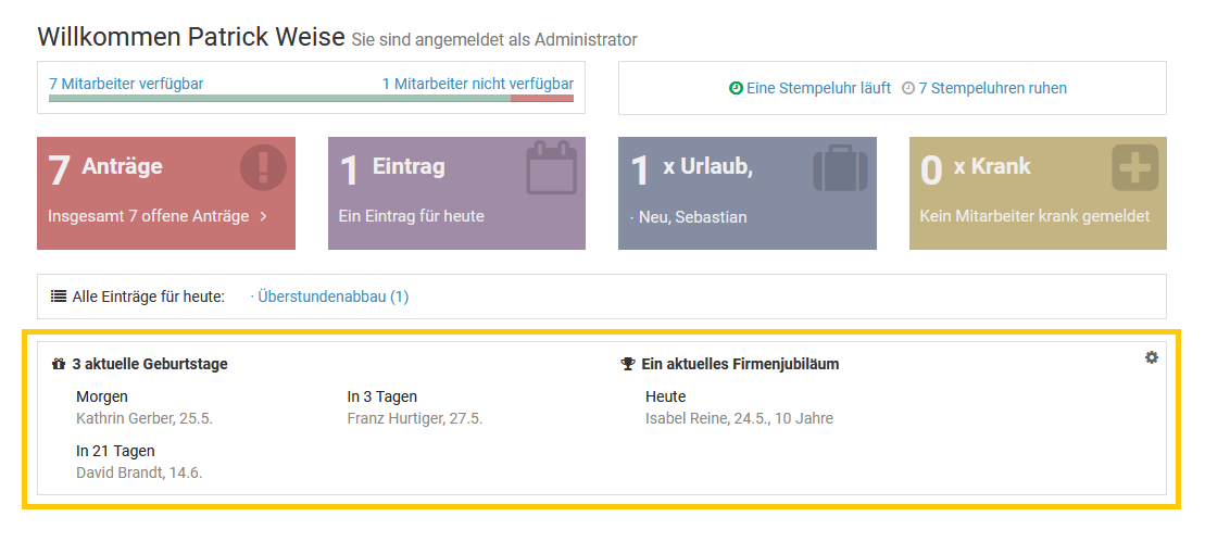 Lesen Sie hier, wie Sie die Geburtstage und das Eintrittsdaten eingeben. Die Geburtstage und Firmenjubiläen werden im Timebutler wie folgt angezeigt:
