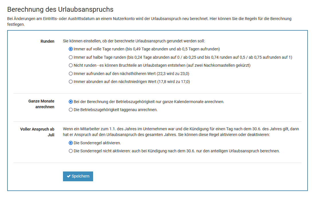 Screenshot: Einstellungen zur Berechnung des Urlaubsanspruchs