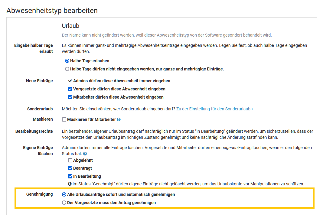 Screenshot: Urlaub als nicht genehmigungspflichtig einstellen