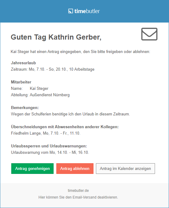 Wenn ein Mitarbeiter Urlaub eingibt, dann startet Timebutler den Genehmigungsworkflow. Der Vorgesetzte wird per Email über den Urlaubsantrag benachrichtigt. Falls dem Mitarbeiter mehrere Vorgesetzte zugeordnet sind, dann findet der mehrstufige Genehmigungsworkflow statt.