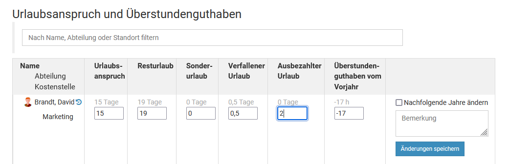 Änderungen speichern". Damit werden dem Mitarbeiter sofort 2 Tage Urlaubsguthaben vom Urlaubskonto abgezogen.