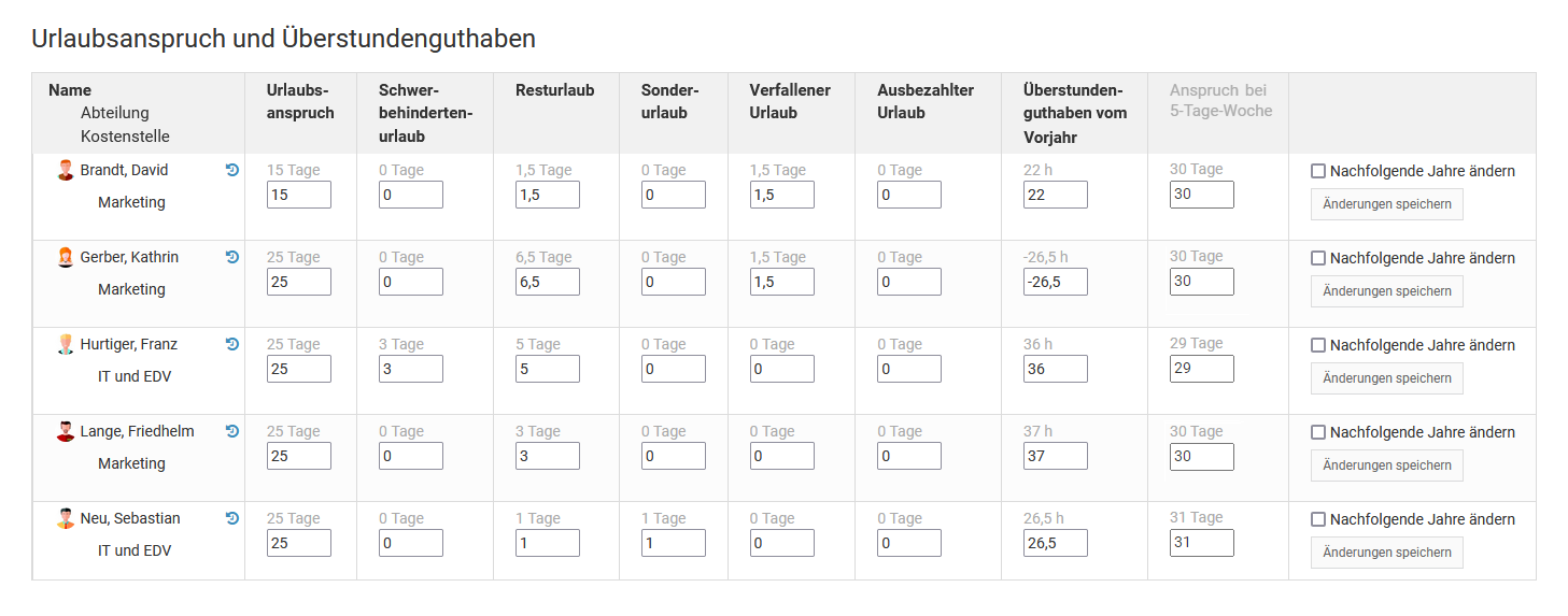 Urlaubsanspruch". Hier können Sie die Werte in den verschiedenen Spalten ändern und speichern.