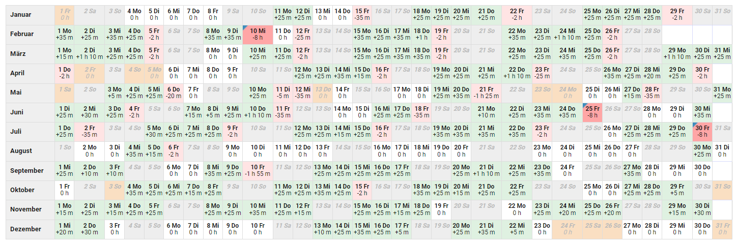 In der Kalenderansicht der Arbeitszeiteinträge erhalten Sie einen schnellen Überblick über die Arbeitszeiten, Überstunden und Minusstunden eines Mitarbeiter im Verlauf des Jahres. Zeiten mit viel Mehrarbeit sind sofort ersichtlich und Sie finden schnell die Ursachen, wenn ein Mitarbeiter einen hohen Minusstand im Arbeitszeitkonto hat.